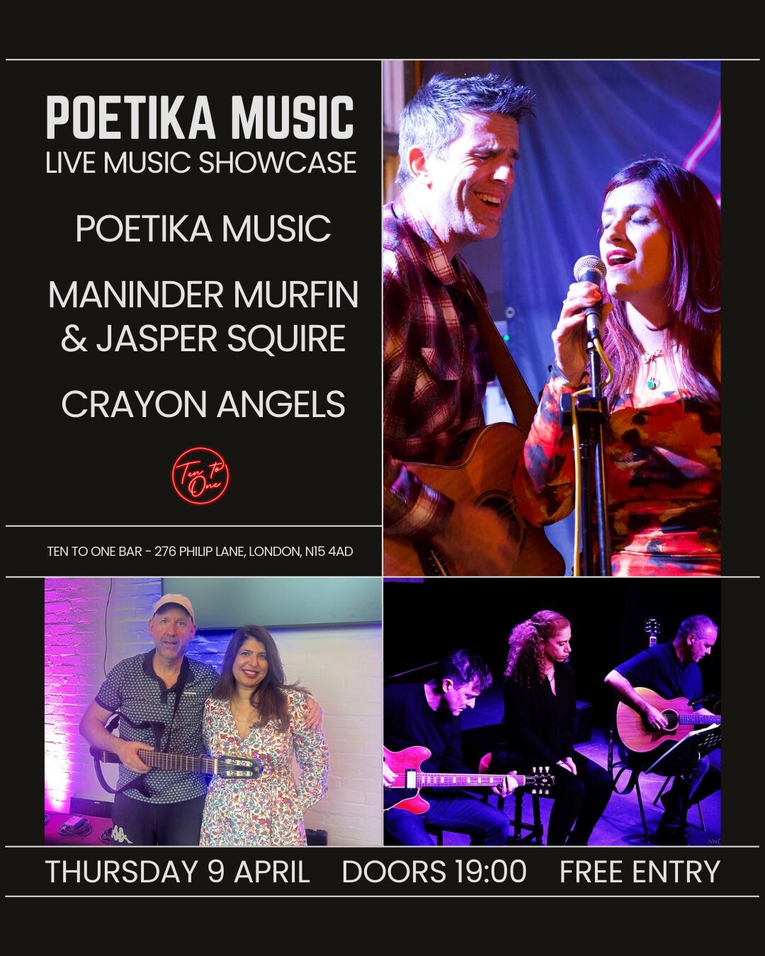 Poetika Music have rounded up some of their favourite performers for an evening of good times at Ten to One on Thursday 9 April. Look forward to sets from the event hosts; Poetika Music as well as Crayon Angels and Maninder Murfin featuring Jasper Squire. Poetika Music Poetika Music bring poetry to life through songs blending soulful melodies with heartfelt lyrics. Kavita and James create intimate listening experiences which resonate with meaning. poetikamusic.com and on Spotify as Poetika Music. Crayon Angels Having reconvened after a hiatus, Crayon Angels still like to think of themselves as three pleasant humans writing and performing some nice songs for grown-ups. Based around the soulful vocals of Natalina Castiglioni, the smart songwriting of Ian Montague and the instrumental colouring of Del Halpin, Crayon Angels have been described not only as ‘quietly magnificent’ but also ‘chock full of melodies’. To date they have released two EPs and one full length album. Maninder Murfin Maninder Murfin is a vocalist and lyricist, praised for a “celestial vocal presence” on her debut original solo single “Wonder How We Wandered” (followed by an EP release with London band “Merfy”). Come and experience a luminous euphony of this original plus reimagined songs from Billie Eilish and other modern pop divas. Maninder regularly teams with Jasper Squire and his beautiful mandolin playing to push the boundaries of their repertoires and stir up musical genres.